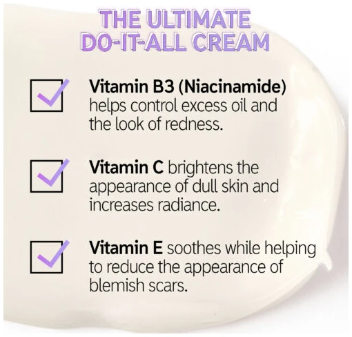 Regardless of skin type, your skin wants niacinamide, vitamin C, and irritation-soothing vitamin E. This antioxidant-rich combination conditions and supports oil production for visibly healthy, hydrated skin in one step. Just what you need, nothing extra—it’s the ultimate do-it-all cream.